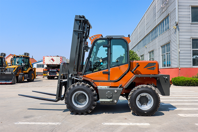 一體式越野叉車(YW35T)為加厚貨叉,精選鋼材提升載重,前輪20.5半實心輪胎,后輪12-16.5真空鋼絲輪胎,后輪轉向,承載 力和脫困能力更強,軸距短,一體式車架,無鉸接,轉彎半徑小,轉向角度大,更適合狹小 空間作業,加裝安全示寬警示燈,保證夜間安全距離作業,發動機后機蓋可向上開啟,更換濾芯更容易,后方擋泥板承載力強,可 供保養人員站立。